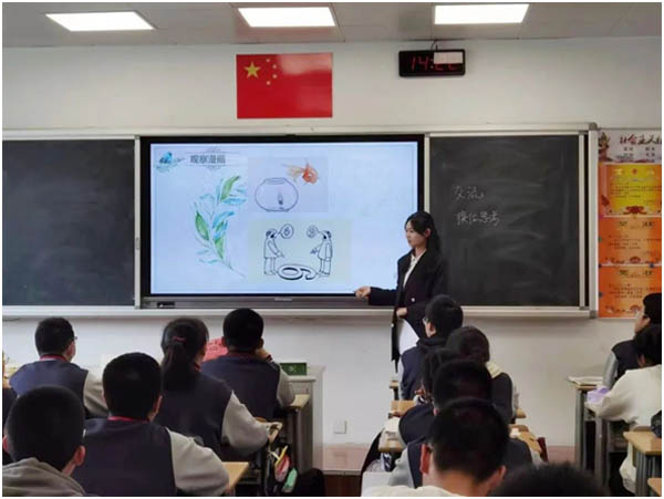 大家首先一起观摩了周蓉老师的一节心理健康课程《人际交往之换位思考》,周蓉老师以班级小游戏和有趣的实验导入让同学们感受人际交往中换位思考的魅力,以丰富的漫画和心理故事指导学生用换位思考的方式处理交往中的矛盾,并联系到家庭、社会乃至整个国家引导学生重视换位思考。