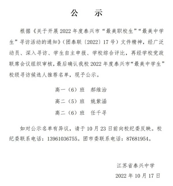 “日月不肯迟,四时相催迫。”在这个属于奋斗者的新时代,希望泰兴中学的每一位学生都能以最美中学生为榜样,把握青春,追逐梦想,在芳华岁月中成就更好的自己,在青春赛道上跨越山海、奋力奔跑,绽放出独一无二的最美花朵,努力成长为担当民族复兴大任的时代新人。