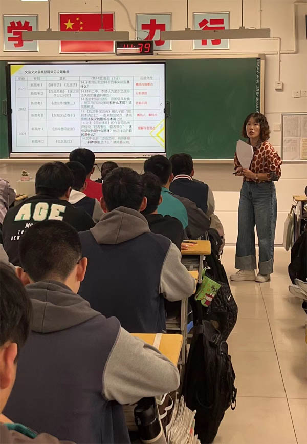 吴秀琴老师开设《小说人物心理变化》示范课课,她以高考真题卷关于小说人物心理的题型导入;呈现刘慈欣的小说《微纪元》,引导同学们结合文本,分析先行者的心理变化过程;在讨论过程中,学生进一步总结提分策略;交流展示环节中,学生以板书形式呈现人物心理的分析,课堂内容环环相扣,师生互动和谐、融洽。