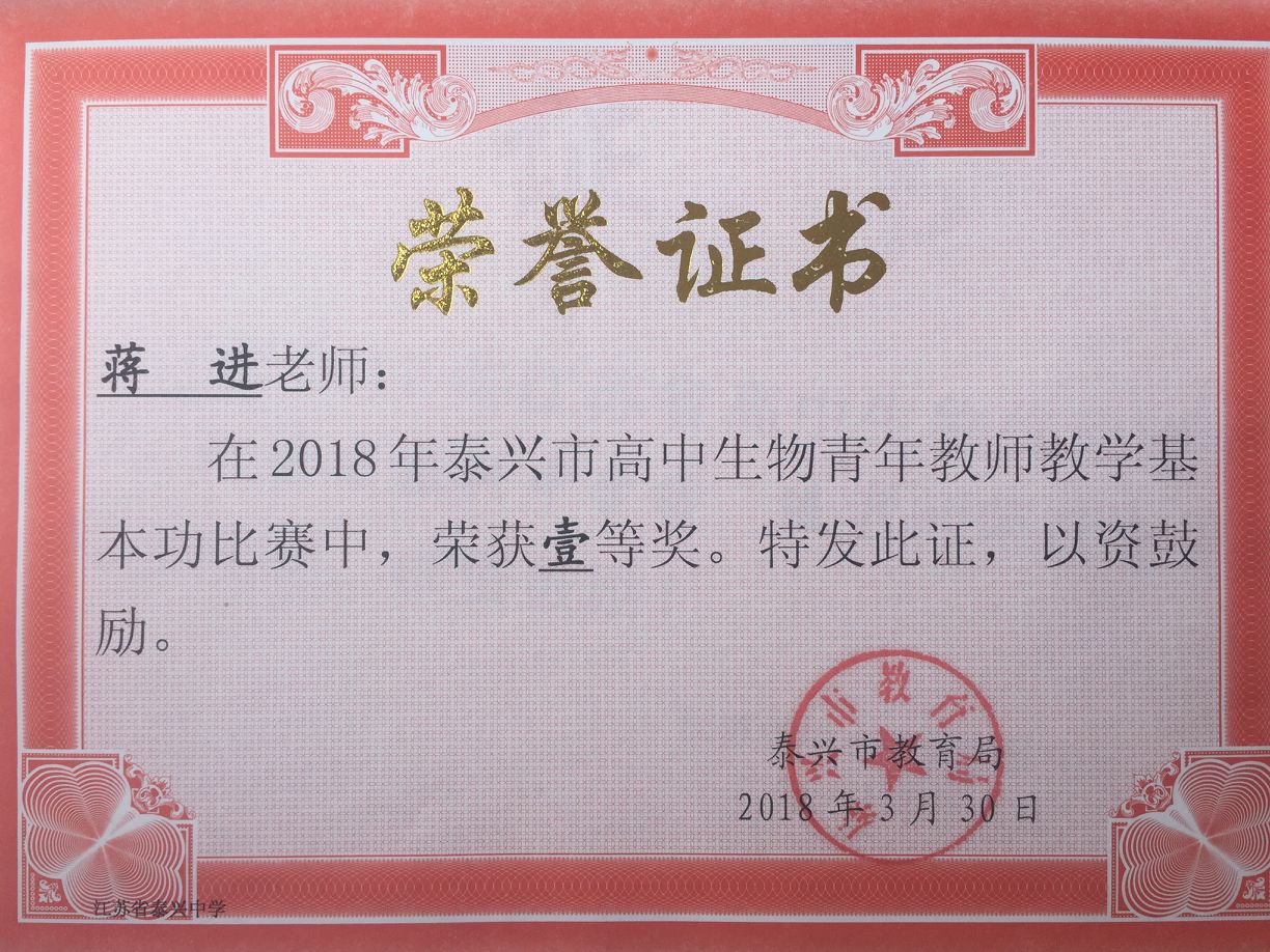 在2018年泰兴市青年教师教学基本功比赛,生物组房舒、蒋进两位老师一路过关斩将最终获得比赛一等奖。