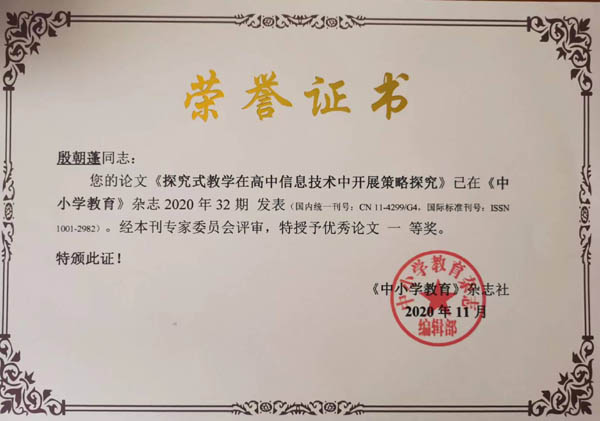 殷朝蓬老师论文《探究性教学在高中信息技术中开展策略研究》被《中小学教育》评为一等奖。