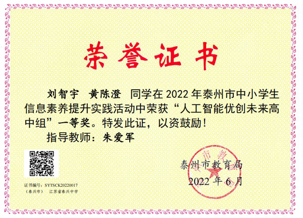 朱爱军老师指导刘志宇、黄陈澄在泰州市中小学信息素养实践提升活动中获一等奖