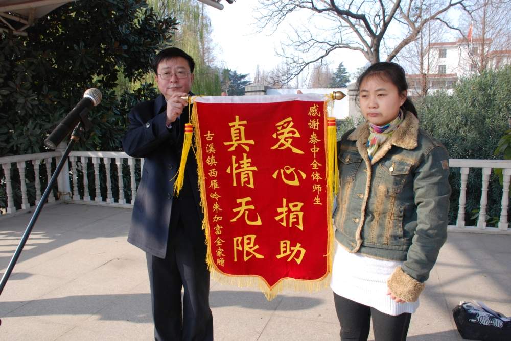 人间有大爱,泰中有真情!12月10日,我校高一(15)班新生朱志强同学的母亲代表全家向全校师生赠送一面写有“爱心捐助、真情无限”的锦旗,市人大常委会副主任、校长王中先参加了活动。
