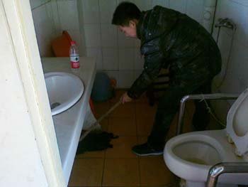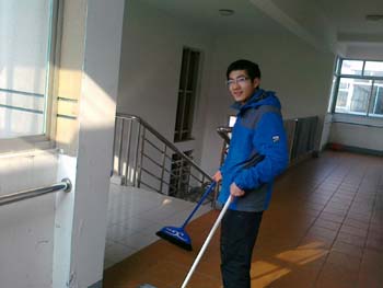 李和陈倾听了一会几个老人的谈话后,便忙着开始了卫生打扫。陈负责清理卫生间,李负责打扫走廊,但说实话,环境本身就很干净了,一是老人们很爱惜这里,二是护工人员工作十分尽职尽力。