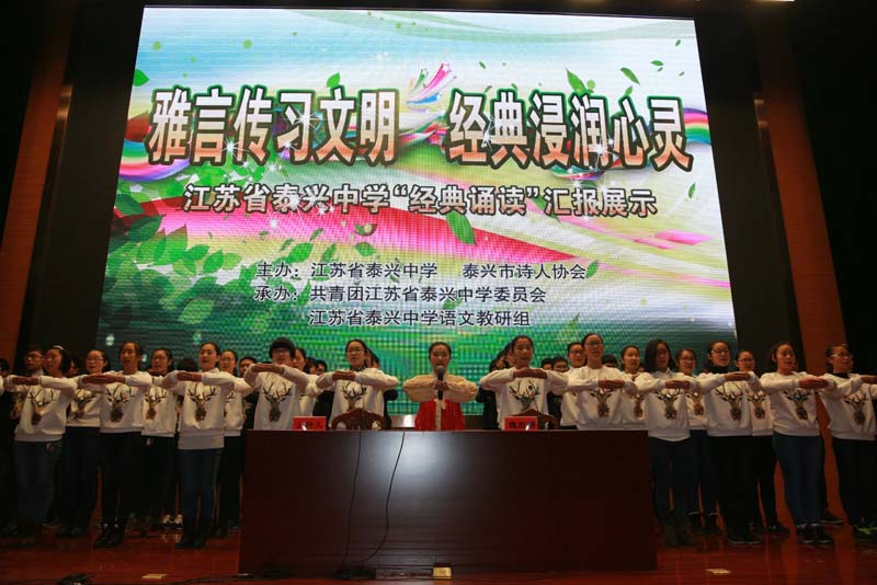 向古典的深流回溯,为绿色的青春吟哦,泰中诗词节如约而至……12月19日下午,由江苏省泰兴中学、泰兴市诗人协会主办,共青团江苏省泰兴中学委员会、泰兴中学语文教研组承办的“雅言传习文明,经典浸润心灵”精美诗文吟诵会在学校报告厅成功举行。高一年级全体同学参加。