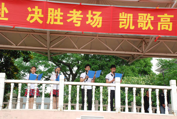 寒窗苦读十数载,只盼今朝金榜题名。在国旗下,高一、高二朗诵队代表全体学弟学妹,献上声情并茂的诗歌朗诵,为即将步入高考考场的高三学子送上最美好的祝福。