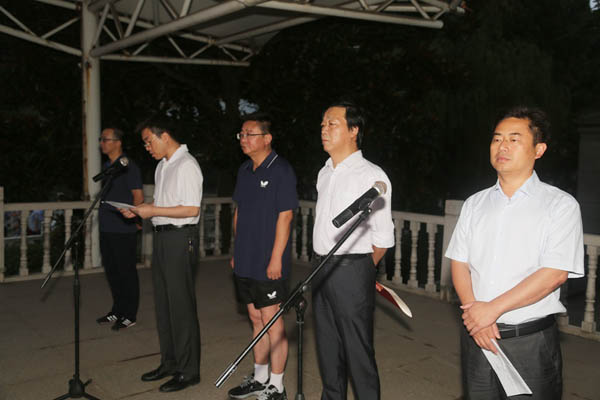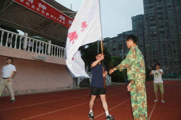 青春励志行,行者志无疆!8月26日上午5时15分,我校2016级新生纪念长征胜利80周年50华里远足活动出发仪式在田径运动场隆重举行。王中先、钱留华、朱熔华、钱凯、栾军、朱金宝等校领导出席仪式。仪式由钱凯主持,钱留华致辞,朱熔华宣读安全注意事项。校长王中先授旗并宣布出发号令。