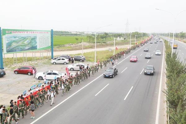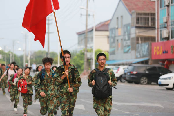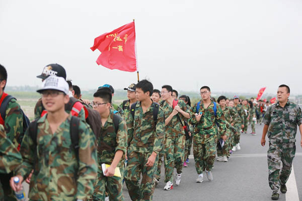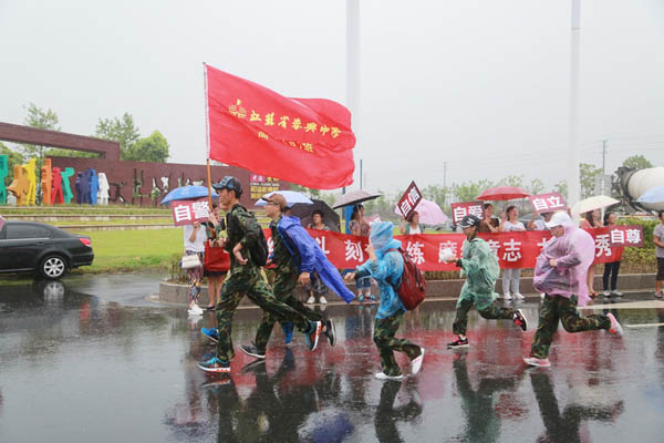 5时30分,近800名学生身着迷彩服,在家长助威团的激励下,以饱满的精神状态踏出校园,开始了50华里的远足黄桥之旅。