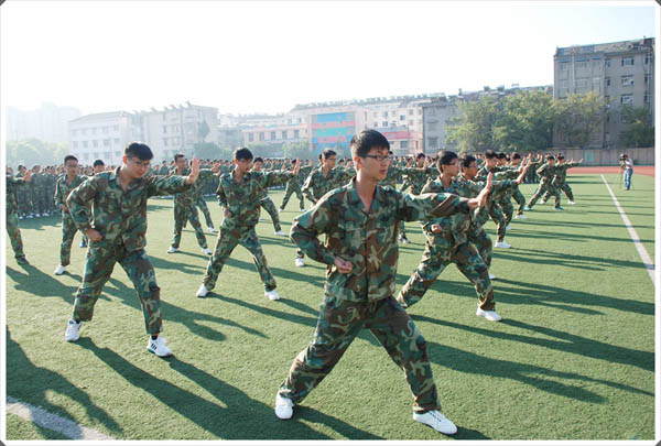 分列式结束后,由男生连组成的擒敌拳表演方队、女生连组成的列队操表演方队进行了汇报表演……运动场上震耳欲聋,展示了新生青春无敌、勇往直前的精神面貌,精彩的表演博得现场阵阵掌声。