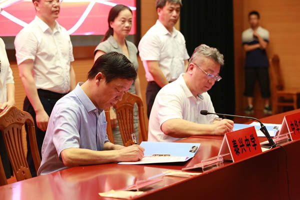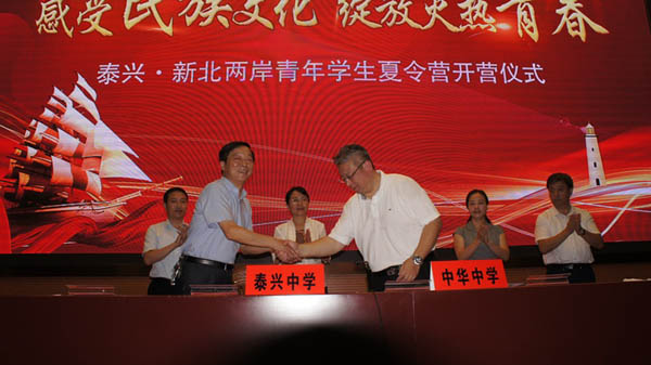 两岸一家亲,携手共前行!7月25日下午4时30分,“泰兴·新北两岸青年学生夏令营”开营仪式在我校隆重举行。泰州市台办主任王晓梅,泰州市台办副主任史庆胜,泰兴市市委常委刘辉,泰兴市人民政府副市长邵骅,台湾新北市中华高级中学校长卞绍庄,泰兴市教育局局长夏立新,我校党委副书记、副校长钱留华出席仪式。邵骅主持仪式。
