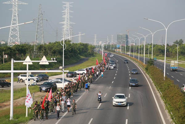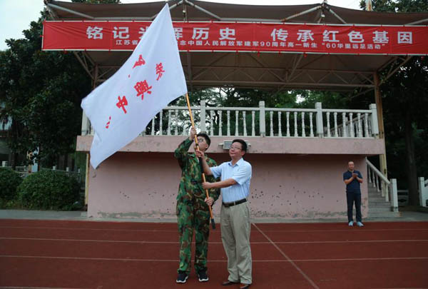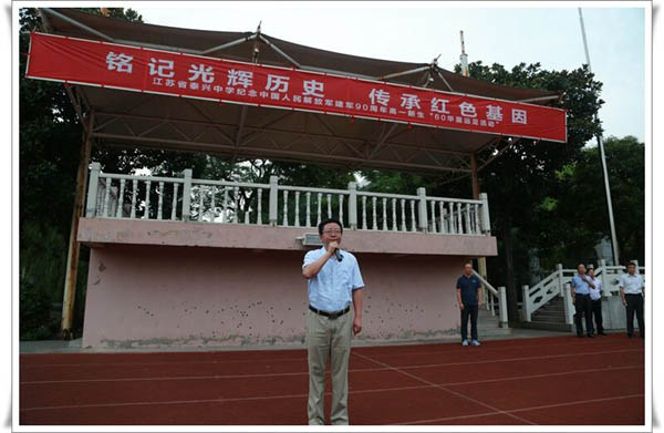 铭记光辉历史,传承红色基因!8月25日上午5时15分,我校纪念中国人民解放军建军90周年高一新生60华里远足活动启动仪式在田径运动场隆重举行。校长王中先及钱留华、朱熔华、钱凯、栾军等校领导出席仪式。仪式由钱凯主持,栾军致辞,朱熔华宣读安全注意事项。最后,王校长授旗并宣布出发号令。