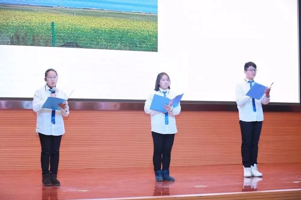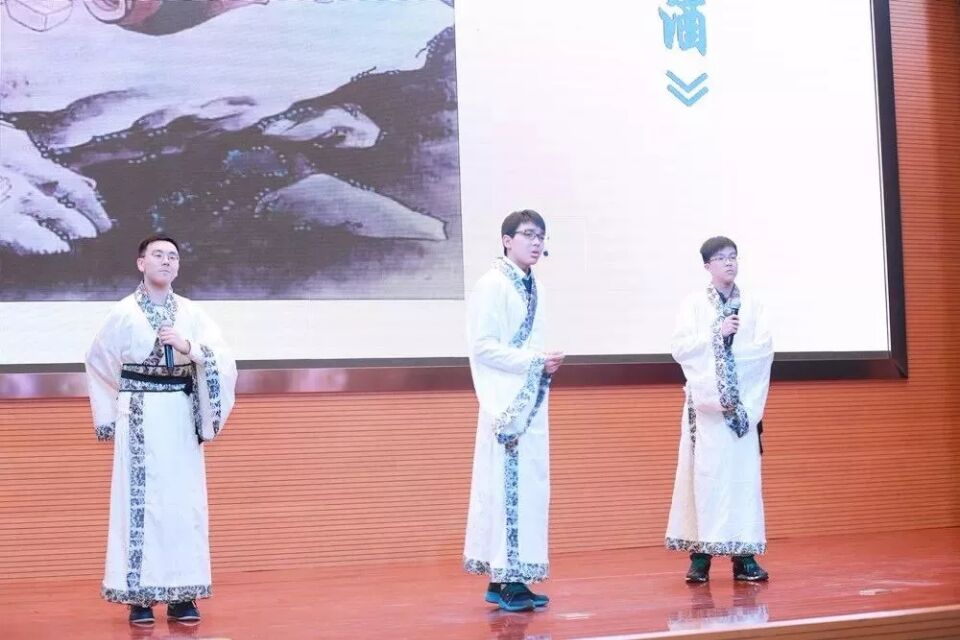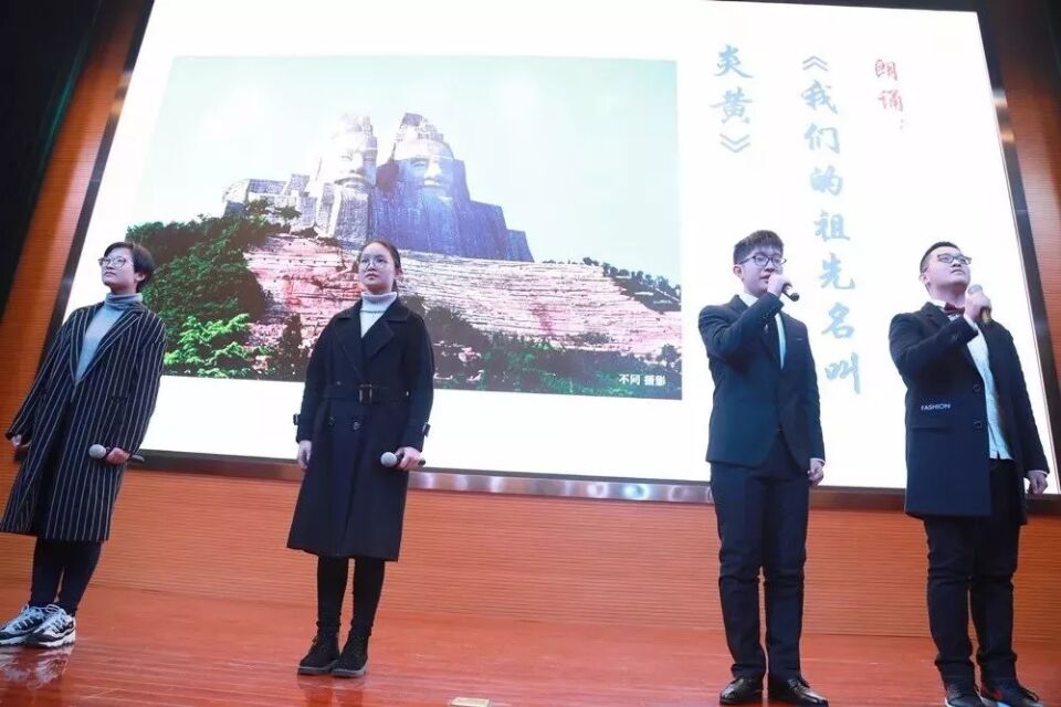 本次活动邀请了国风古诗文吟诵社的同学们带来吟诵表演《将进酒》,校朗诵队的领诵张智阳、戴浏、金莹同学带来了荣获2017泰州市经典诵读比赛特等奖的获奖节目《我们的祖先名叫炎黄》,充分展示了我校经典诵读培训的喜人成果。