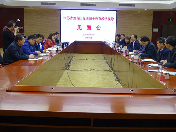 为了全面贯彻党的教育方针,全面落实立德树人根本任务,深入推进新课程新教材实施工作,3月10日至12日,省教育厅副厅长顾月华带领省厅视导专家组一行近50人对我校进行教育教学视导。市委副书记、市长张坤,市委常委、宣传部部长张红霞,副市长王亮出席见面会。泰州市教育局副局长王俊鹏、泰州市教研室主任石志群、泰兴市教育局局长夏立新、泰兴市教师发展中心主任顾建新,我校领导班子全体成员全程参加。泰州市教育局局长万永良,我市市委副书记、市长张坤,副市长王亮,市教育局局长夏立新,以及泰州、泰兴市教育局相关负责人和教研员出席视导反馈会。我校领导班子成员及中层以上干部,各学科教研组长、备课组长参加会议。