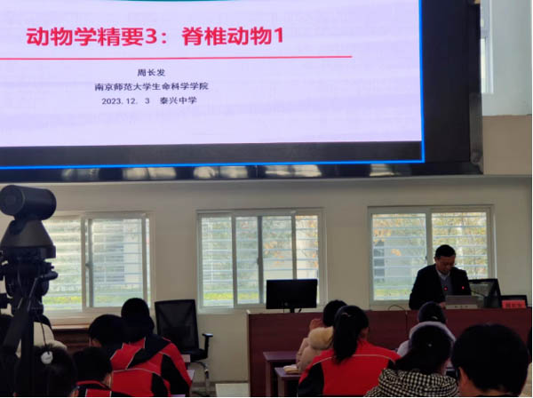 南师大动物学和生态学专家周长发教授开展“教授进中学”专题学术讲座,我校部分生物老师,高一、高二及兄弟学校部分生物学竞赛学生参加活动。周教授以“脊椎动物”为主题,从“节肢动物的进化突破”讲起,再通过对脊椎动物的脑、骨骼、肾等组织器官的形态结构比较及发育演化,引领学生们探索脊椎动物的奇妙世界,激发他们对生命科学的热爱和兴趣。