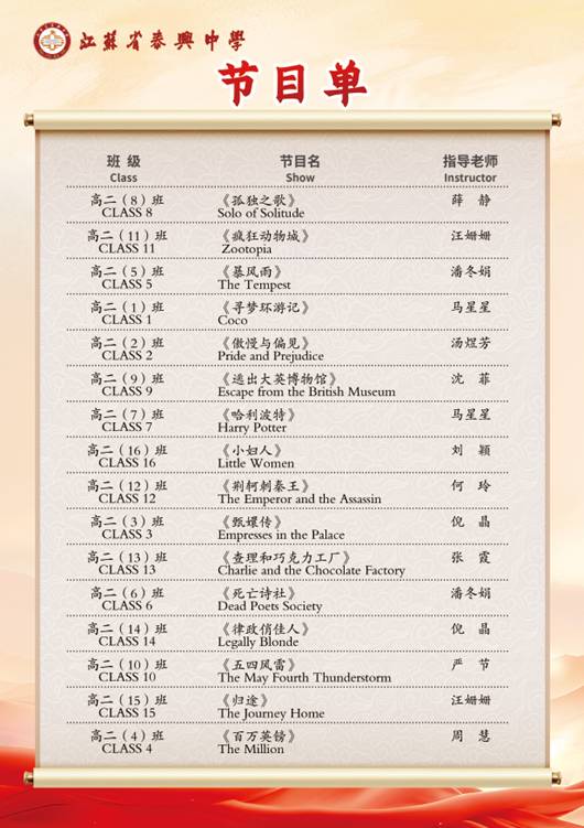 戏剧表演作为校园文化艺术节的传统项目,涵盖经典名著、历史故事、现实题材等多元主题。今后,我校将继续以多元语言实践活动为载体,让英语学习从“知识积累”转向“能力运用”,从“文化输入”转向“文化表达”,助力同学们在语言与艺术的碰撞中,成长为兼具人文素养、国际视野与责任担当的新时代青少年。