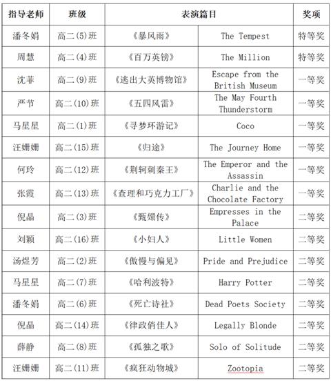 12月7日晚,我校高二年级在报告厅举办英语话剧大赛。校党委副书记、纪委书记戴宏华,副校长施礼兵,政教处副主任、高二年级部主任钱继兵,校团委书记常建伟,高二年级部副主任李建新,校团委副书记叶琳出席。高二年级全体师生参加活动。张海丽、李兰花、肖彦、孙甜甜、郑天威等5位老师担任评委。